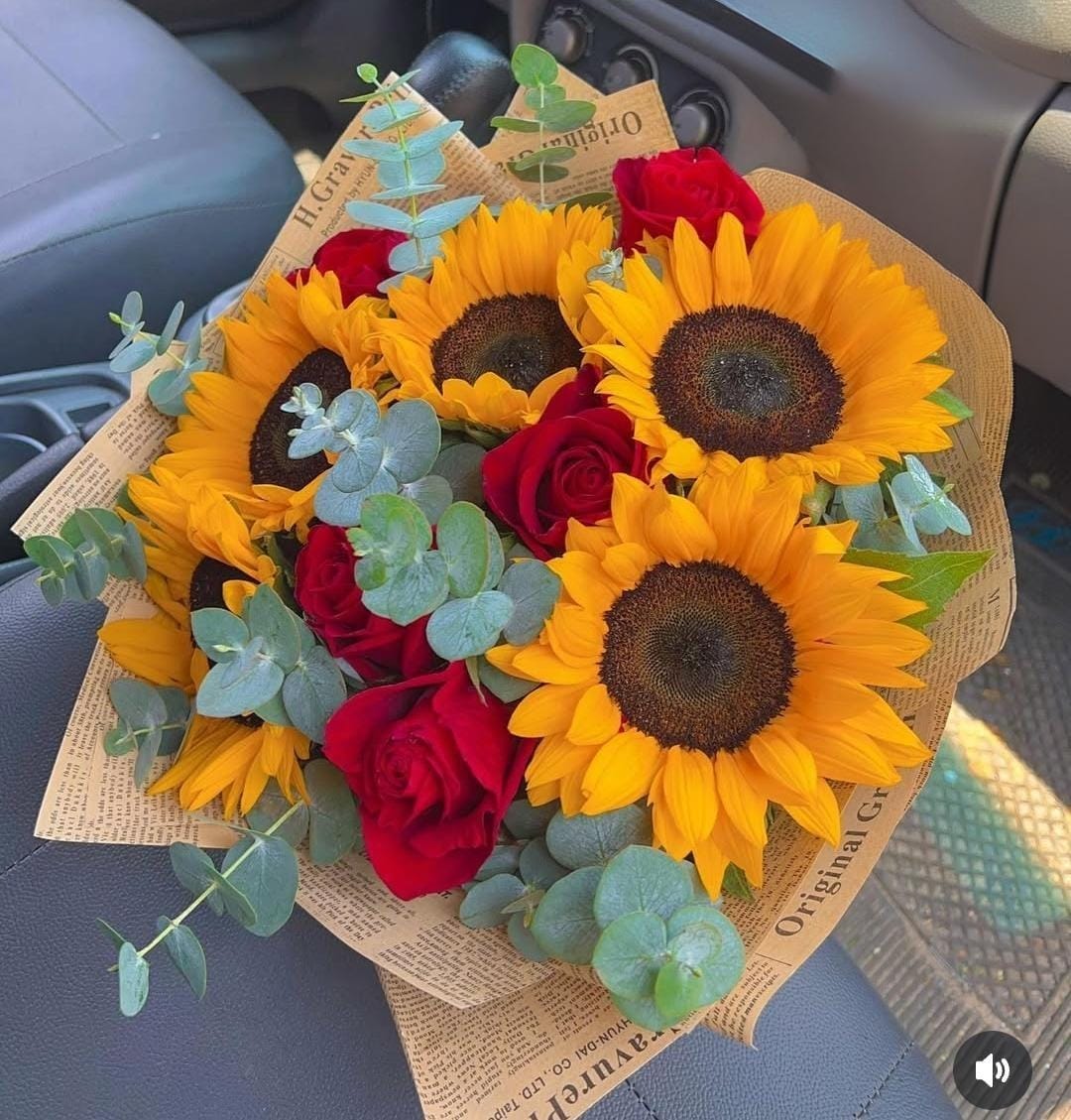 Regala este ramo de girasoles y rosas rojas